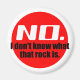 Este ímã de geladeira apresenta um logotipo vermelho com o texto "Não. Não sei o que é aquela rocha." Para aqueles que recebem pedidos demais para dar nomes a rochas misteriosas.