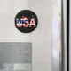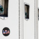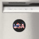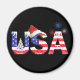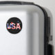 "EUA" nas Estrelas e Stripes com ícones e cristais, uma árvore de Natal e um chapéu de Papai Noel em "EUA", e flocos de neve em vermelho, branco e azul no fundo. Design exclusivo dos EUA para as estações de férias.