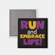 Se você gosta de correr, correr 5Ks, 10Ks, meia maratona, ou maratonas, você vai adorar este design de texto colorido em roxo e amarelo que lê Run and Embrace Life! Corra e Abraça Camisas de Vida, capuzes, ímãs, botões, cartões, adesivos, correntes-chave e muitos outros itens para corredores que adoram um design brilhante e colorido!
