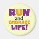 Se você gosta de correr, correr 5Ks, 10Ks, meia maratona, ou maratonas, você vai adorar este design de texto colorido em roxo e amarelo que lê Run and Embrace Life! Corra e Abraça Camisas de Vida, capuzes, ímãs, botões, cartões, adesivos, correntes-chave e muitos outros itens para corredores que adoram um design brilhante e colorido!