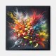 Uma explosão vibrante de frutas frescas, incluindo maçãs, morangos, bananas e bagas, arranjada artificialmente num padrão de rotação dinâmico. Placas brilhantes de cores — vermelhos, amarelos, verdes e azuis — se entrelaçam com as frutas, criando uma composição enérgica e viva. O pano de fundo é escuro para aumentar a vivacidade das cores e a frescura das frutas, evocando um sentido de vitalidade e abundância.