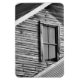 Imagem chamada "Vistas do Passado", um prédio rústico com placas laterais, duas linhas de telhado íngremes e uma janela ao largo do centro. Tirada em preto e branco. Íman
