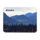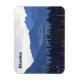 Montanhas azuis, água azul do lago, árvores verdes escuras, algas rosa e encharcadas. Uma representação do verão no extremo norte. A leitura de texto "Alaska" também é exibida. Mosquitos não incluídos.