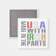 Leituras, em caracteres viscosos, FEITAS NOS EUA COM PARTES IRLANDESAS. Os EUA mostram em letras vermelhas, brancas e azuis. O irlandês aparece em verde, branco e laranja.