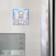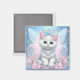 Uma adorável princesa de fada, um gatinho branco com joias, flores cor-de-rosa e asas de fada sobre um fundo azul cintilante.