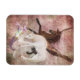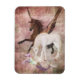 Uma pintura digital de um Pegasus marrom, unicórnio branco e um cavalo de sereia colorido (Hippocampus), em um fundo castanho, rosa, verde texturizado.