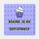 Para quem gosta de assar. A imagem é um cupcake de contornos, com o slogan "Baking is My Superpower" em letras negrito. O cupcake está em azul e creme com estrelas, e as espirais de gelo são brancas. Um fundo azul claro com cupcakes azuis dispersos completa o design.