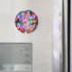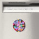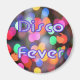 Íman redondo com uma imagem de luzes de disco de cor arco-íris e a menção "Febre Disco" em letras claras e escuras roxas. Veja toda a coleção de ímãs Disco 70s em TOUCHES ESPECIAIS | Seção Favoritos para festas.