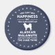 Você não pode comprar felicidade, mas pode adotar um Malamute do Alasca e isso é bonito muito a mesma coisa em letras brancas maiúsculas sans serif com a silhueta de uma raça de cães do tipo Malamute do Alasca. Enquadrado com um círculo de pegadas. Enquadrado em um círculo de pegadas.