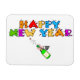 Feliz ano novo com frasco de Champanhe e rolha com bolhas.