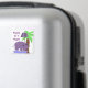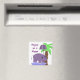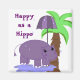 Um hipopótamo bonito andando na água com um guarda-chuva roxo sombreado. Uma palmeira ao fundo. Diz "Feliz como Hippo"