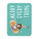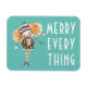 Uma garota branca de cabelos vermelhos decolou em uma roupa de inverno colorida com texto branco de "Feliz Tudo" em fundo aqua.