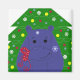 Um hipopótamo azul giro com um arco vermelho em volta do pescoço gordinho parado em frente a uma árvore de Natal. Os ornamentos coloridos e designs de flocos de neve soam a árvore.