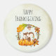 Feliz imã de Ação de Graças com um esquilo fofo parado atrás de algumas abóboras cor de água laranja. Uma coroa foliar rodeia-os com uma folha de carvalho e flores laranja e outros ramos e folhas. O fundo é uma cor creme, com um olhar áspero envelhecido à volta das bordas.