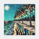 Arte bonito e romântica costeira de Ai, que representa uma fila de palmeiras com luzes brancas iluminadas sobre elas. Uma bonito reflexão sobre a praia e as ondas arenosas.