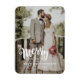 Este imã de Natal é perfeito para mostrar sua foto favorita de casamento. A frente tem cheio abrindo para sua foto e a palavra "Feliz" em uma fonte de script branco em negrito com opções para personalizar com seu sobrenome e ano.