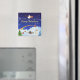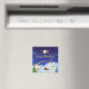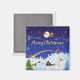 Snowscapes bonitos com árvores de Natal, casas, um homem da neve, uma igreja, e um arco-íris com flocos de neve de queda. Papai Noel que voa sobre uma Lua cheia na noite de Natal.