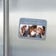 Azul empoeirado moderno salve o ímã de manutenção do anúncio de data apresentando uma colagem de 3 fotos e "Salve a Data para Nossa Felicidade Sempre Depois" em uma mistura de simples tipografia branca e um roteiro branco de chic com pincéis. Seus primeiros nomes e data de casamento estão juntos com um coração.