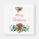 Um ímã com um bonito buquê floral em cores vermelha, dourada e verde. Um quadro de ouro atrás das flores. Feliz Natal escrito dentro.