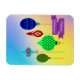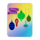 Feliz feriado com vários ornamentos pendurados. Os "Cartões de natal" estão em uma faixa de fita roxa! Os ornamentos são multicoloridos e cada ornamento tem uma cor diferente. Um ornamento é verde claro com formas ovais verdes escuras. Outro ornamento tem forma oval com cor verde-média com linhas rosa de lado a lado. O 3º ornamento é azul escuro com pretos azuis claros. O quarto ornamento é vermelho profundo com um design branco sobre ele e o ornamento do 5 é azul claro com ovais cor-de-rosa e dentro a oval cor-de-rosa são estrelas azul-claro.