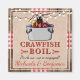 Este design de estilo rústico apresenta um fundo de madeira com fita de estilo de toalha de mesa de piquenique vermelha e branca. Em cima disso, há uma textura de aniagem com um lagostim de desenho animado fofo. A fonte serifada e manuscrita vermelha e preta é totalmente personalizável para o seu evento, seja um cozido de lagostim, lagosta, frutos do mar ou peixe. Celebre seu noivado, aniversário, formatura ou qualquer evento com estilo! Estes fazem ótimos brindes de festa para guardar!
