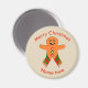 Este incrível ímã apresenta um desenho fofo de um homem colorido de pão de gengibre. ele tem botões vermelhos e verdes, um grande sorriso no rosto e bruxas vermelhas e verdes em volta das pernas, prontas para uma festa de Natal.