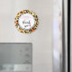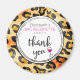 Um ímã de agradecimento para uma festa de solteira com um padrão de estampa de animal selvagem de pintas de leopardo para o fundo. Um copo de vinho com aparência legal com um contorno de tinta preta grossa e preenchido com vinho rosa quente. Obrigada escrita em uma fonte manuscrita da moda dentro de um círculo branco.