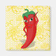 Um personagem de desenho animado de pimenta vermelho e quente. Design original com padrão de local de ouro (impressão amarelo) no fundo. Ímanes personalizados. Ideia decor para todas as festas que você pode imaginar! Ideia para amantes de comidas picantes.