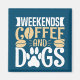 Amantes de cães que também adoram café e fins de semana adorarão esta design em bolsas, canecas, T-shirts, e muito mais com texto de bronzeado e branco com grãos de café e uma pata de cachorro que lê Weekends Café and Dogs!