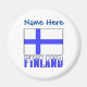 Íman redondo com a bandeira finlandesa, que tem um fundo branco com um escandinavo azul, ou Cruz Nórdica. Aqui mostra com a palavra FINLÂNDIA debaixo da bandeira. Acima, é um lugar para o seu nome, em letras azuis, ou de outra pessoa, se você quiser personalizar um presente. A favor do partido excelente ou o porteiro.