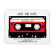 Aqui está um design de estilo retrô divertido que inclui uma combinação de fitas de áudio das décadas de 60 e 70. Personalize este ímã guarde a data com o(s) seu(s) nome(s), data e local do evento de casamento. Casamento divertido guarde o ímã de geladeira para os seus hóspedes serem exibidos na geladeira ou no conselho magnético.