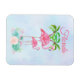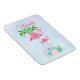 Íman flexível de viagem. O texto diz Flórida. Projetado com uma ilustração de um flamingo cor-de-rosa mãozinho e bebê parado em um leito de flores florais suculentas com palmeiras verdes balançando nas costas. Tropical e bonito. O fundo é uma aquarela azul-claro de verão com pistas de púrpura.