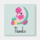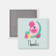 Obrigado imã com uma bela ilustração de um flamingo cor-de-rosa com algumas melancias e abacaxis. Esquema de cor rosa e verde. Sumério e tropical. O fundo é uma cor verde pálida com bolinhas brancas.