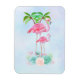 Magnet com ilustração de um flamingo rosa-mama e bebê parado num leito de flores florais suculentas com palmeiras verdes balançando nas costas. Tropical e bonito. O fundo é azul claro.