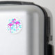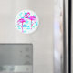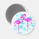 Íman tropical com dois flamingos cor-de-rosa diante de um fundo floral azul. Personalize com qualquer texto desejado.