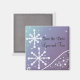 Flocos de neve brancos bonito soam este fundo brilhante de azul e mauve nesta imã salve a data. Personalize com suas próprias informações.