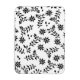 Um design clássico com uma flor, um botão e folhas. Uma design delicada, feminina, elegante. Em preto clássico e branco.