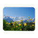 Esta incrível foto do Getty Images mostra a paisagem do campo com flores amarelas nos Alpes suíços em frente às famosas montanhas Eiger Monch Jungfrau perto de Grindelwald e Interlaken.