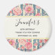 Íman de aniversário com um belo padrão, com flores bonito cor-de-rosa, sobre um padrão listrado composto por listras azuis e creme. Um quadro retangular com uma borda falsa de folha de ouro colocada sobre cima e seu dentro de texto personalizado.