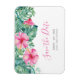 Estes noivos salvam a data em que ímanes exibem uma parte superior de flores e folhas de palma rosa-tropicais. Use os campos modelo para adicionar seu texto personalizado. Para ver mais convites e ideias de casamento de destino, visite www.zazzle.com/dotellabelle Arte e design de aquarelas únicas de Victoria Grigaliunas do Do Tell A Belle.