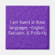 Colocada sobre uma brilha roxa como o fundo que simplesmente diz: "Sou fluente em três idiomas - Inglês, Sarcasmo, & Profanação"