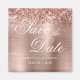 Rosa de ouro fino com ouro rosa e ombre cor-de-rosa para o seu casamento, exceto a data dos pequenos ímãs quadrados. A fonte decorativa "Salvar a Data" é um estilo clássico de caligrafia de rico em conjunto com um estilo de fonte moderno. O brilho feminino reluz e design de folha de impressão de arte digital como uma foto neste ímã.