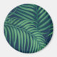 Palma tropical verde deixa gráficos sobre fundo azul escuro.