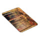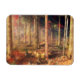 Raios de luz quente do sol do outono passam pelas árvores amarelas e vermelhas na borda da floresta e iluminam as folhas caídas no chão da floresta. Mais profundo na floresta onde as sombras são mais escuras ainda há vislumbres de ouro e cremson.