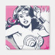A Mulher Maravilha desviando facilmente os ataques com suas bandas de braço nesta rocha de anos 80 inspirou um gráfico de colagem rosa e marinho.