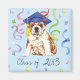 Felicite seu formando favorito com um presente com um formando bonito de Bulldog vestindo um tabuleiro no meio de um fardo de confete.