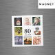Um ímã para uma festa de 80 anos para um homem, celebrando sua vida com uma colagem de 8 fotos suas. Modelos para a idade 80 e uma data. Data de nascimento ou data da festa. Letras pretas. Fundo branco. Perfeito como lembrança da festa, recordação ou como um lembrete de save the date para seus convidados.