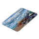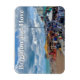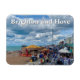Brighton Beach está agitada com atividade, apresentando os restos icônicos do Pier Ocidental à distância e um carrossel vibrante com uma cobertura vermelha e amarela no primeiro plano. A promenada é animada com visitantes, e o céu está pontilhado com nuvens fofinhas contra um pano de fundo azul brilhante.