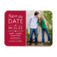 A design de imã salve a data de de fotografia moderna apresenta uma tipografia mista com relevo cardíaco e relevo de relevo redimensionado. Personalize com seus detalhes de casamento e uma foto de noivado favorita. Cor vermelha de Garnet.