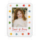 Um ímã de fotos de feriado bonito com sua foto vertical cercada por gotas coloridas. A frase "Doce e Feliz" é exibida em letras de script de pincel vermelho com seu nome e o ano mostrado abaixo. O imã de Natal é perfeito para mostrar a foto do seu filho ou uma foto fofa fofa do(s) seu(s) animal(es)!